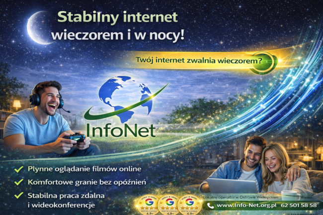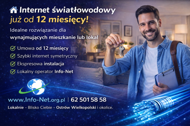 Wynajmujesz mieszkanie lub prowadzisz firmę w lokalu na czas określony? W Info-Net oferujemy światłowód z umową już od 12 miesięcy — bez wieloletnich zobowiązań. ✅ idealne rozwiązanie dla najemców✅ stabilny internet do pracy i rozrywki✅ szybka instalacja bez niszczenia posesji✅ lokalny operator z Ostrowa Wielkopolskiego Internet dopasowany do Twojej sytuacji — nie odwrotnie. 📞 Zadzwoń…