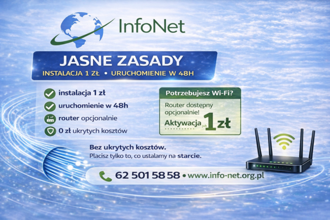 Szukasz szybkiego i niezawodnego internetu światłowodowego w Ostrowie Wielkopolskim? W Info-Net stawiamy na przejrzyste warunki, lokalną obsługę i ofertę bez niespodzianek. Naszą przewagą są jasne zasady, które klienci doceniają od lat: instalacja zawsze za 1 zł, szybkie uruchomienie usługi nawet w 48 godzin, a także brak ukrytych kosztów i dodatkowych opłat, o których klient dowiaduje…