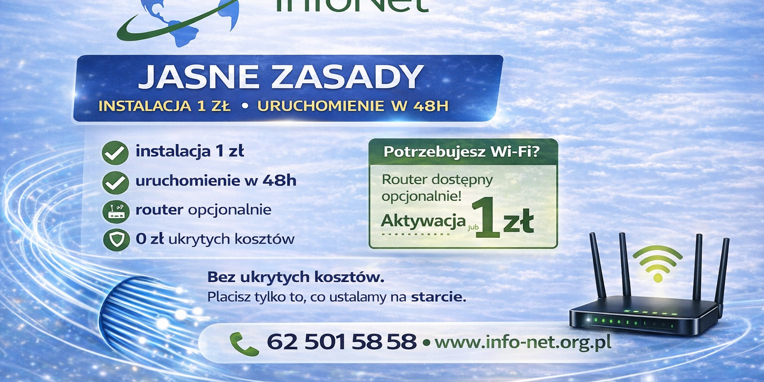 Szukasz szybkiego i niezawodnego internetu światłowodowego w Ostrowie Wielkopolskim? W Info-Net stawiamy na przejrzyste warunki, lokalną obsługę i ofertę bez niespodzianek. Naszą przewagą są jasne zasady, które klienci doceniają od lat: instalacja zawsze za 1 zł, szybkie uruchomienie usługi nawet w 48 godzin, a także brak ukrytych kosztów i dodatkowych opłat, o których klient dowiaduje się dopiero po podpisaniu umowy.
